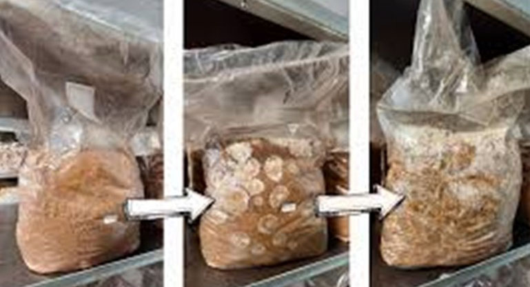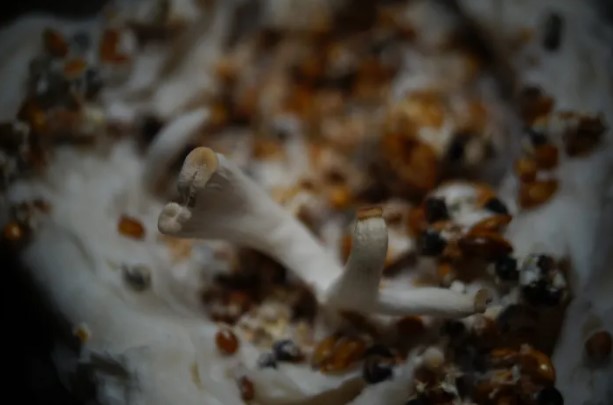 Una vez que el sustrato esté completamente colonizado, será firme y blanco velloso. Puede sumergir el cultivo en agua durante 12 horas y/o dejarlo a muy baja temperatura (refrigerador) durante 24 horas para inducir una fructificación más rápida.